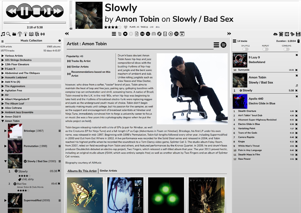 RompЯ is a music player with the emphasis on discovery - discovering more about the music you know, and discovering new music you don’t know yet. RompЯ is an interface that runs in a web browser on any device and controls a music player which can be on any other device. I recommend using Mopidy as the music player. When used with Mopidy and a Spotify Premium subscription RompЯ is a powerful Spotify client with many music discovery features.
