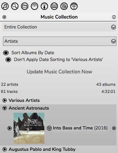 - Albums (by Artist) - displays all albums at once sorted first by Artist, then either alphabetically or by date