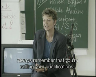 'In the summer of 1996, we filmed application training courses in which one learns how to apply for a Job. School drop-outs, university graduates, people who have been retrained, the long-term unemployed, recovered drug addicts, and mid-level managers - all of them are supposed to learn how to market and sell themselves, a skill to which the term "self management" is applied. The self is perhaps nothing more than a metaphysical hook from which to hang a social identity. It was Kafka who Iikened being accepted for a job to entering the Kingdom of Heaven; the paths leading to both are completely uncertain. Today one speaks of getting a job with the greatest obsequiousness, but without any grand expectations.' (Harun Farocki on The Interview)