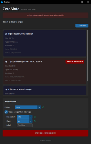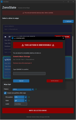 ZeroSlate - Forensic drive wiper. Nukes drives so forensic recovery tools find nothing.