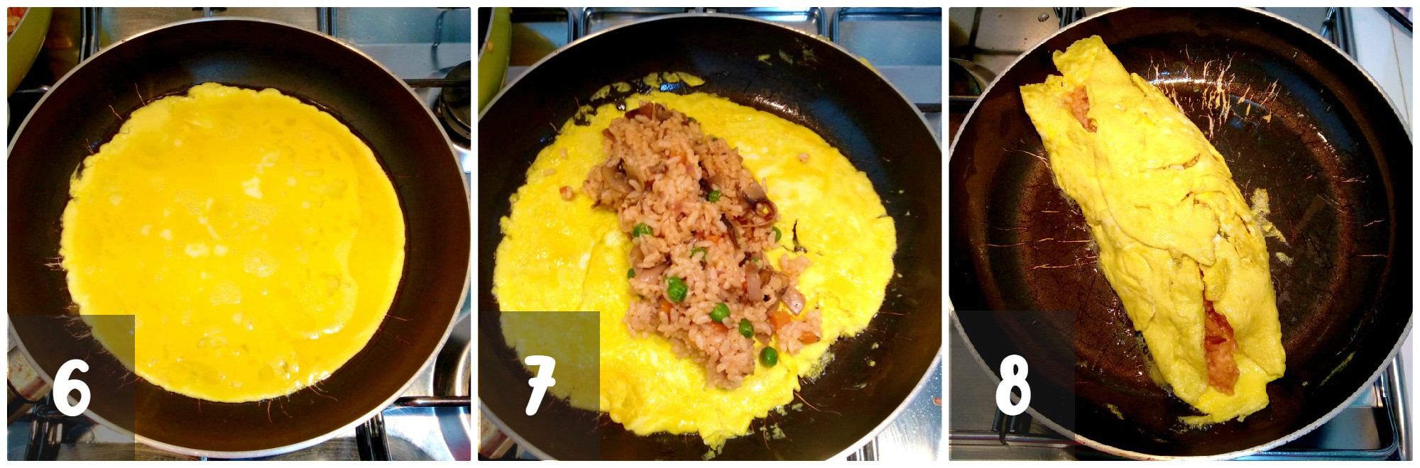 - Per ogni omelette: in una ciotola mettere 2 uova e 1 cucchiaio d’acqua e mescolare. In una padella, scaldare un pò d’olio e, quando sarà caldo, versare l’uovo sbattuto. Cuocere l’omelette a fuoco lento, solo nella parte inferiore.