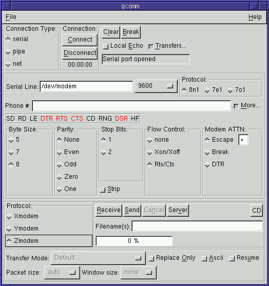 Here is another snapshot of gcomm with the serial port "more detail" panel open and the file transfer panel open: