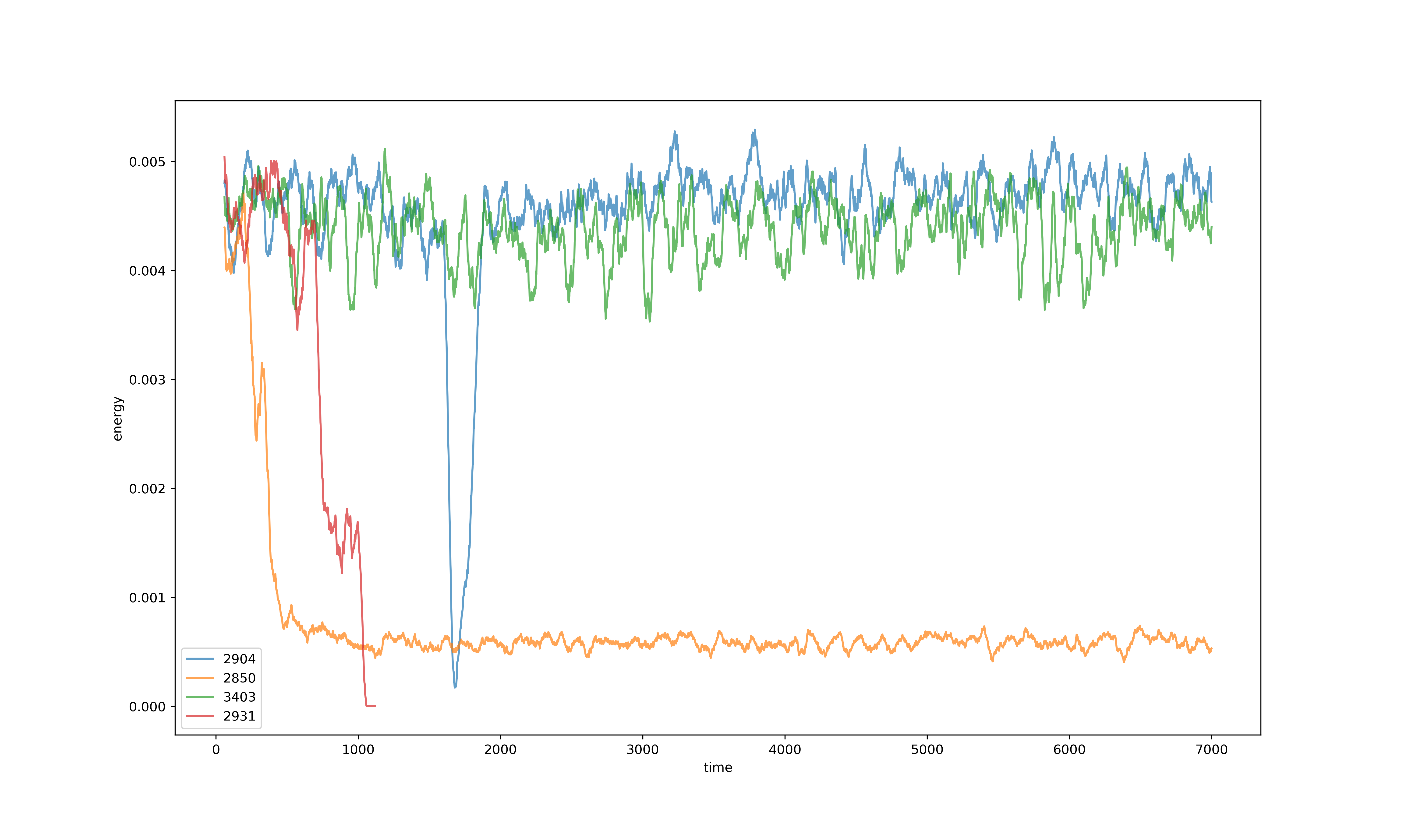 the run labeled '2904': the energy drops, then suddenly rises again. I was very happy: that was my final goal for this project! I then inspected