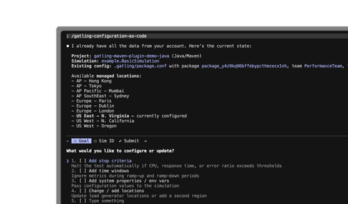 Connects your AI assistant to Gatling Enterprise Edition. Ask it about your infrastructure in plain language: teams, packages, simulations, load generator locations. All read from your real account, in real time.