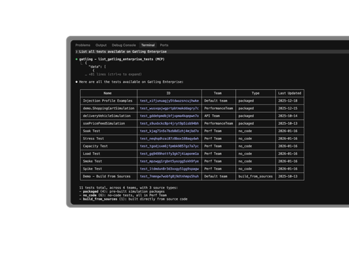 Pull your live teams, locations, packages, and tests from Gatling Enterprise via the MCP server