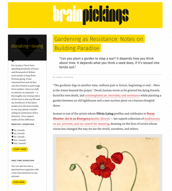 Maria Popova’s Brain Pickings is a model for personality-driven artistic newsletters. These types tend to be built around a single creator where the main value given to readers is the creator's unique perspective. Popova uses their publication to “explore what it means to live a decent, substantive, rewarding life.”