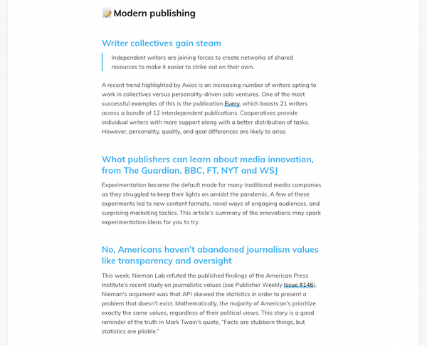 Curators generally offer subscribers a shortlist of topic-focused links along with a brief summary of each one. For example, Publisher Weekly sends a weekly email containing “the most important stories, ideas & resources about independent publishing.”