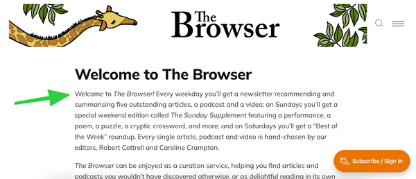 The Browser, a curation-focused newsletter, does an excellent job of this. In the first paragraph on their welcome page, new readers learn that they’ll be receiving a curated list (type) every weekday (frequency) made by their two editors (Robert and Caroline).