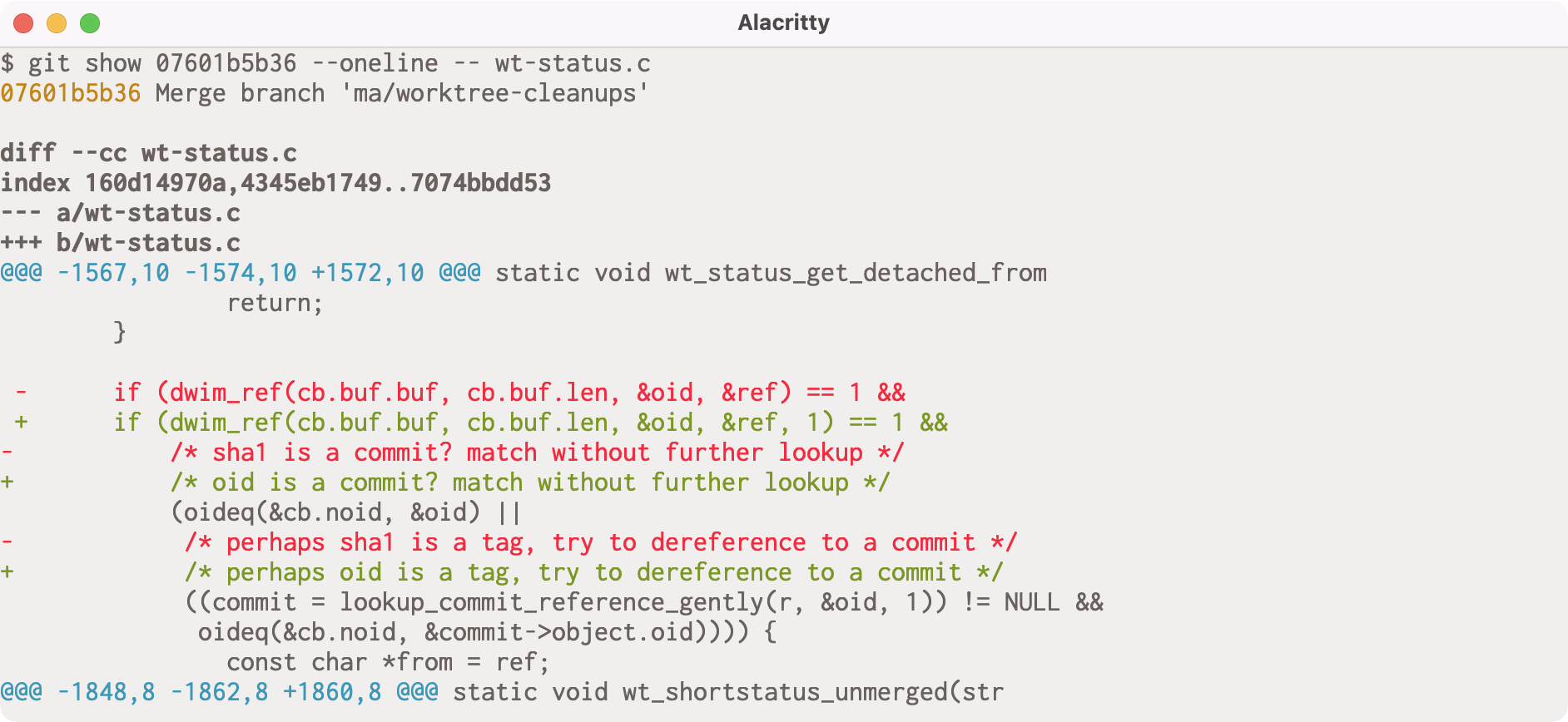 This release brings another new feature powered by ort, which is the --remerge-diff option. To explain what --remerge-diff is and why you might be excited about it, let’s take a step back and talk about git show.
