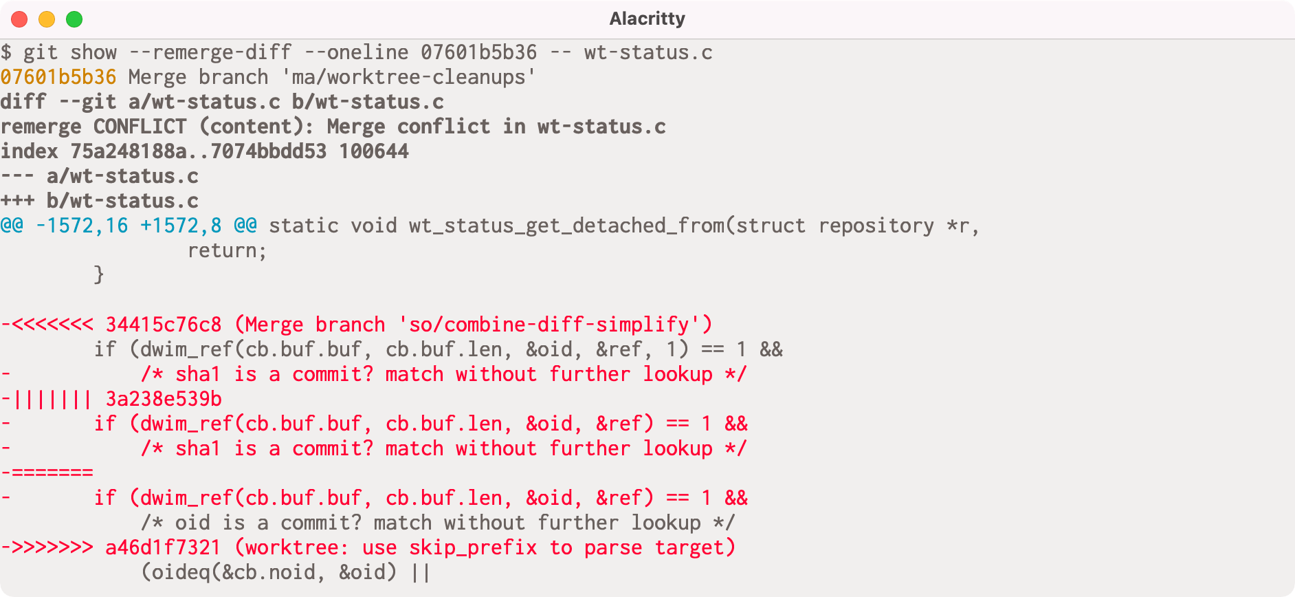 The above shows the output of git show with --remerge-diff on the same conflicted merge commit as before. Here, we can see the diff3-style conflicts (shown in red, since the merge commit removes the conflict markers during resolution) along with the resolution. By more clearly indicating which parts of the conflict were left as-is, we can more easily see how the given commit resolved its conflicts, instead of trying to weave-together the simultaneous diff output from git diff-tree -cc.