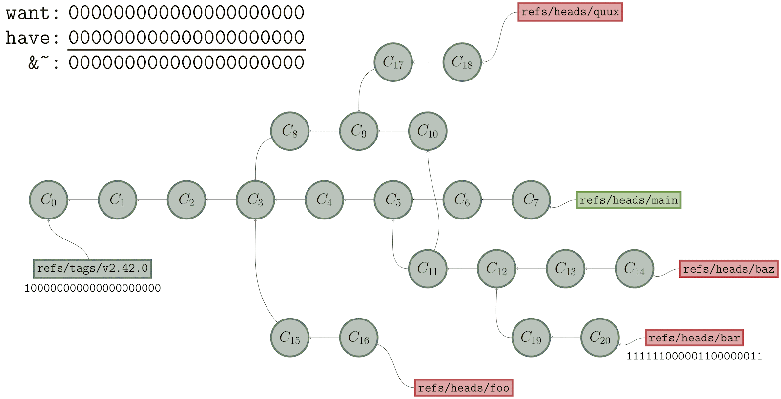 ), we walk along the commit graph, marking each of the corresponding bits in ourhave