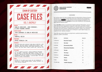 Case Files is an anthology series for Liminal Horror. Each volume contains a collection of the Bureau's investigative case files that have slipped into public hands, which include an assortment of strange and horrid creatures, supplemental mechanics, ready to run scenarios, and new character options for when you're looking for a quick night of play or to supplement your ongoing campaigns.