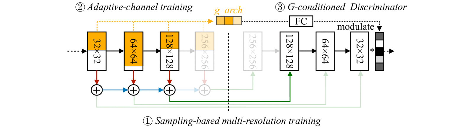 With ① Sampling-based multi-resolution training; ② adaptive-channel training; ③ generator-conditioned discriminator, we can achieve high image quality and consistency at different resolutions and channels.