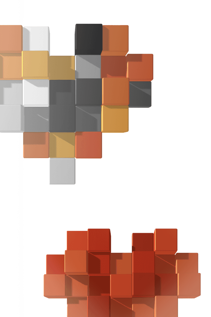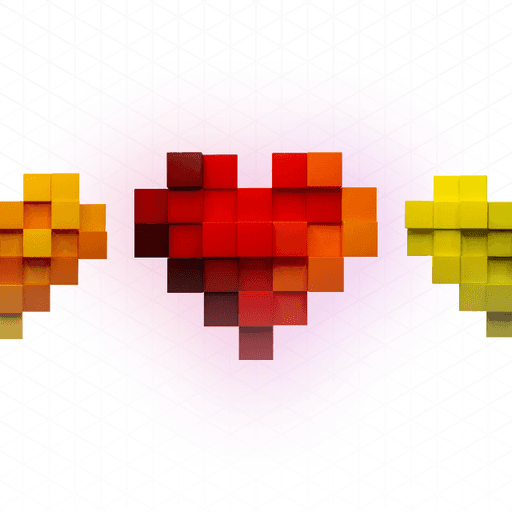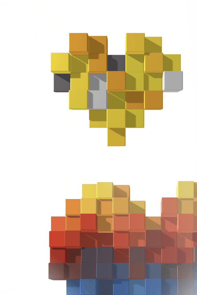 Unique 3D hearts composed of vibrant, color-blocks, each with distinctive structure and depth.