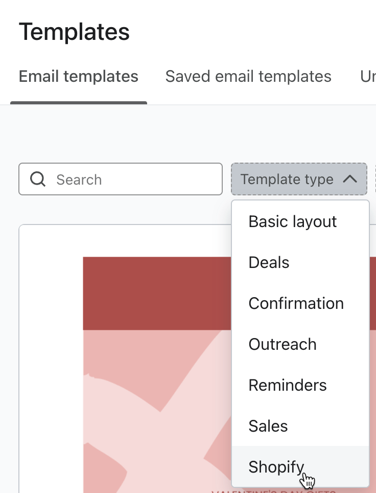- From the Email templates tab, click the Template type dropdown and select Shopify.