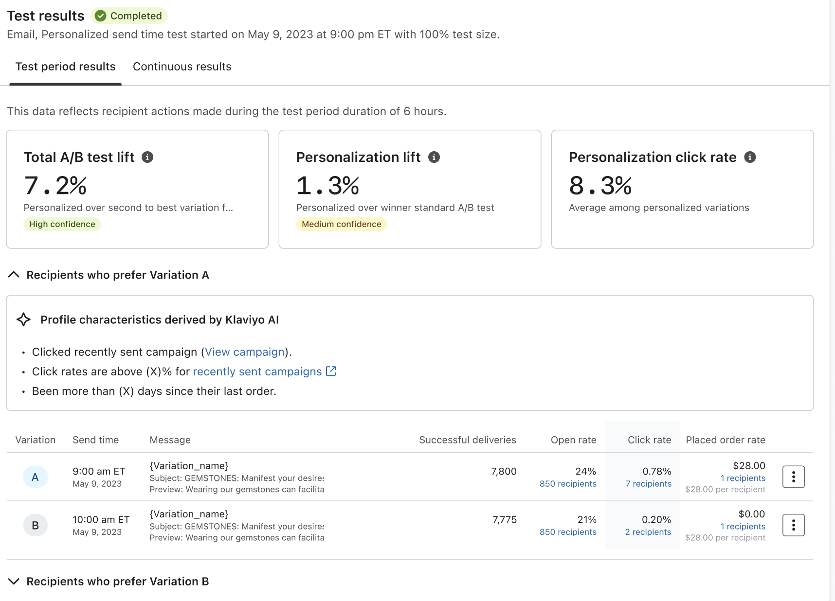 Below these results, you can review the open, click, and placed order rates for every variation in the test.