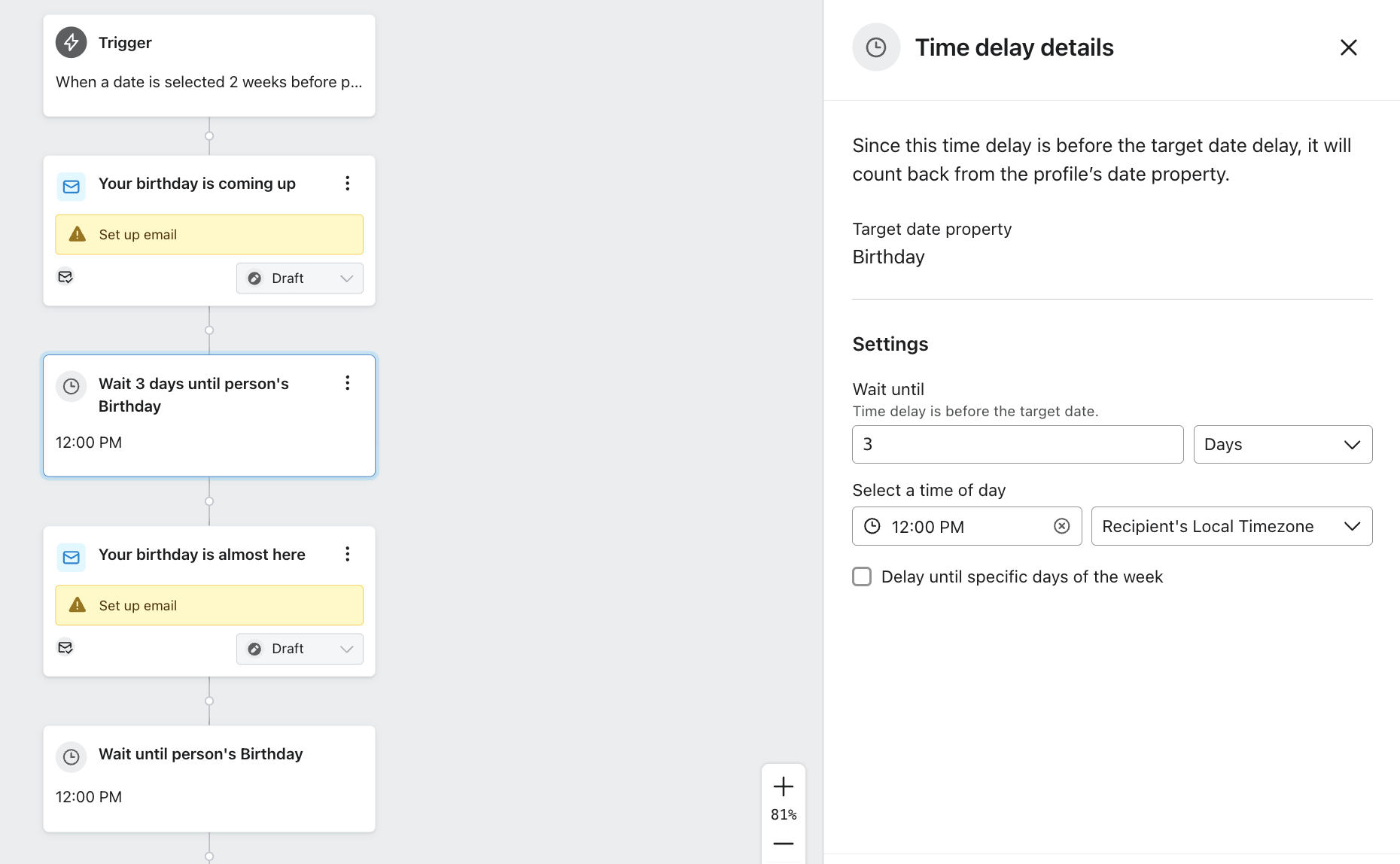If you drag in a time delay after the target date delay anchor point, the setup will be the same as a regular time delay. You will be prompted to set the delay to wait a certain number of days/weeks/months after the previous step.