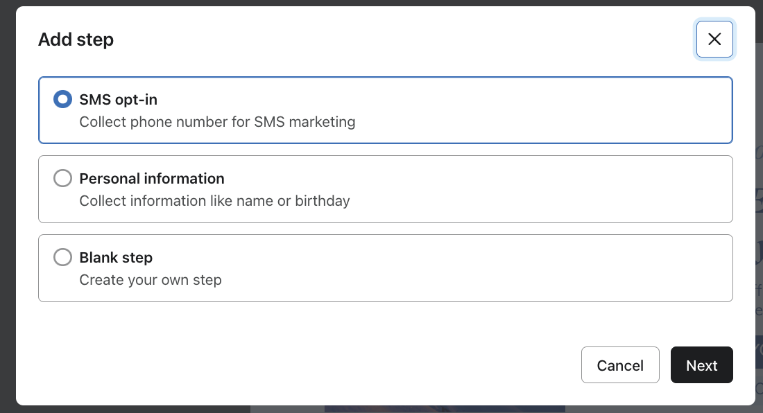 Create a new sign-up form with a blank template and add additional form steps. We recommend using the first step of your form to collect subscribers for your primary marketing channel, whether that’s email or SMS, and then asking for other information on the following steps.