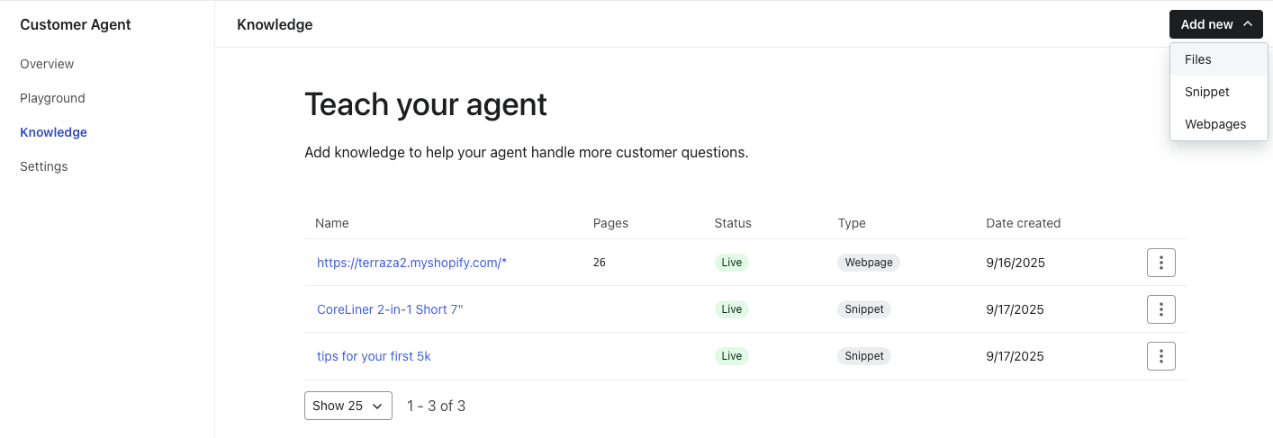 - Prerequisites: Customer Agent must be enabled for your account. You should have at least one knowledge source (e.g., website sync, snippets, or files) connected.