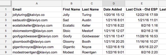 - Si utilizas una propiedad Klaviyo, utiliza el nombre de la propiedad Klaviyo como cabecera de la columna.