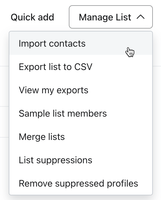 - Si no aparece el botón Añadir rápidamente, significa que o bien no tienes los permisos de usuario correctos para subir contactos, o bien se trata de un segmento, no de una lista.