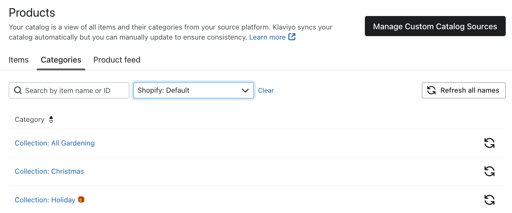 - Las nuevas categorías y la pertenencia de artículos a una categoría concreta se sincronizan desde Shopify cada 6 horas, por lo que una resincronización de categorías es útil para ver la información más actualizada en Klaviyo.