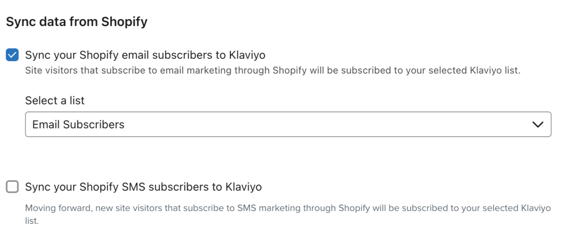 Si aún no lo ha hecho, lea nuestra guía sobre cómo empezar con Shopify para obtener instrucciones paso a paso sobre la integración antes de continuar con este artículo. Cuando realice la integración, asegúrese de marcar la configuración para sincronizar los suscriptores de correo electrónico de Shopify con una lista de Klaviyo.