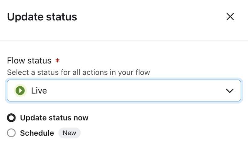 Aprende a cambiar los estados de varias acciones de un flujo simultáneamente en el constructor de flujo. Esto facilita, por ejemplo, poner en directo todo un flujo en 1 clic o pausar toda la actividad rápidamente cambiando las acciones a manual o borrador.