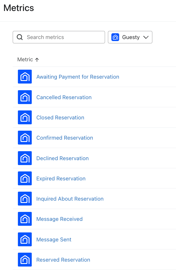- Aquí puedes ver toda la métrica de tu cuenta. Las métricas con un icono de Guesty representan todas las métricas sincronizadas desde tus integraciones de Guesty.
