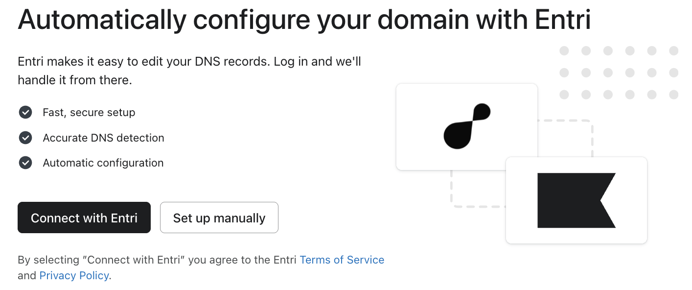 - Indiquez si vous souhaitez connecter un domaine avec Entri ou le configurer manuellement.