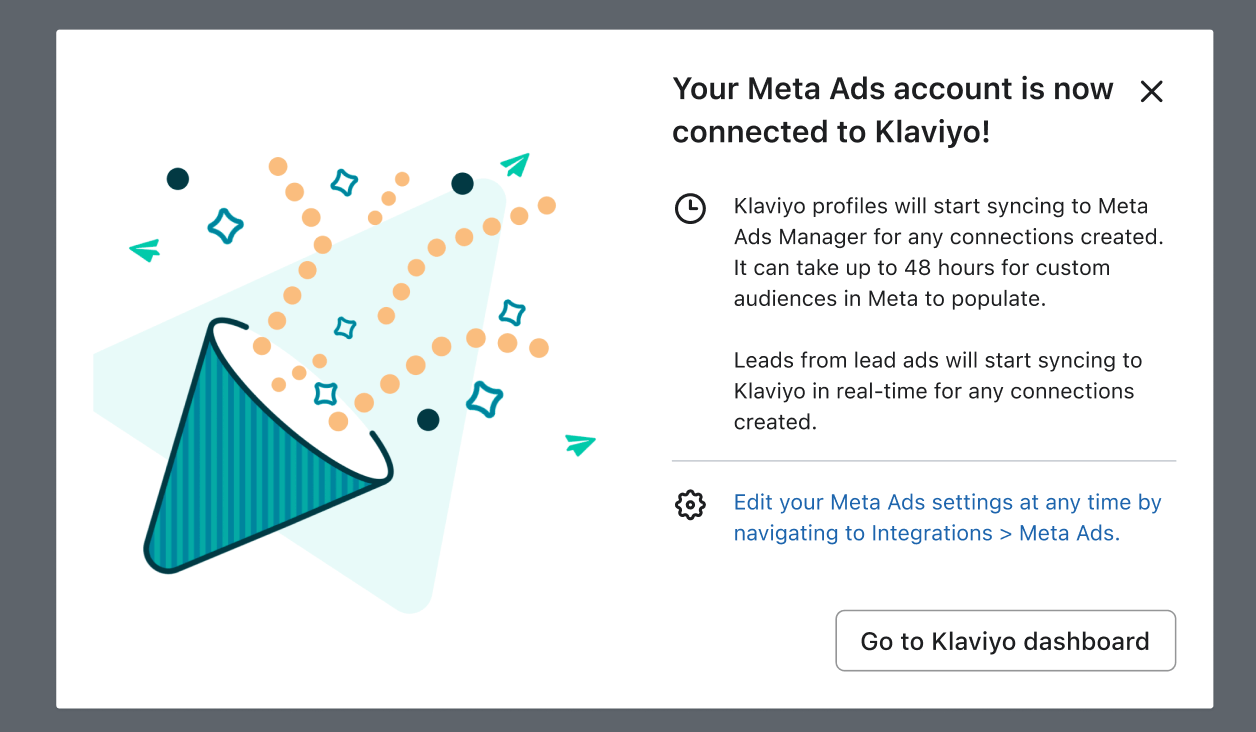 - Vous recevrez un message indiquant que votre compte Meta Ads est connecté à Klaviyo.