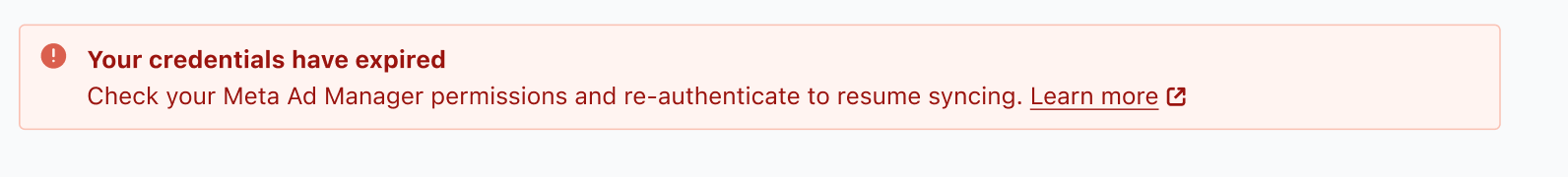 - Vos informations d'identification ont expiré. Vérifiez les autorisations de votre gestionnaire Meta Ad et ré-authentifiez-vous pour reprendre la synchronisation.