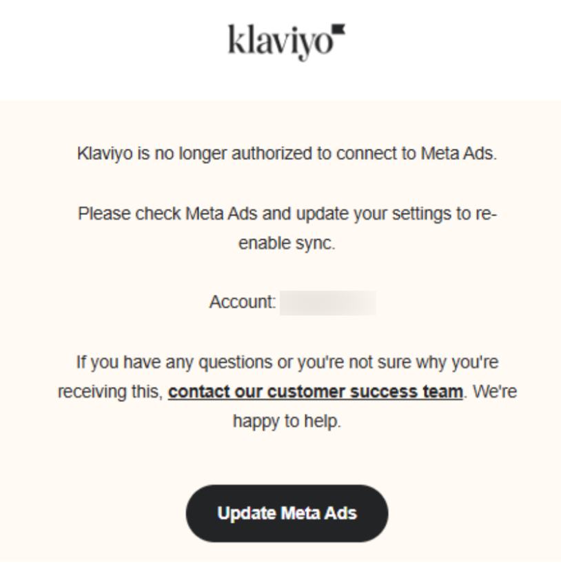 - Klaviyo n'est plus autorisé à se connecter à Meta Ads. Veuillez vérifier Meta Ads et mettre à jour vos paramètres pour réactiver la synchronisation.
