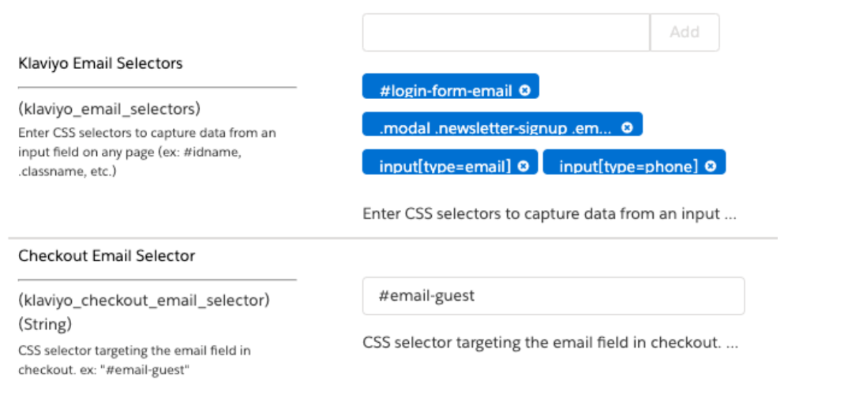 Les préférences du site Klaviyo Email Field Selectors sont utilisées pour cibler toutes les adresses électroniques et tous les numéros de téléphone figurant sur le site (à l'exception de l'adresse électronique figurant sur la page de commande, qui est traitée ci-dessous). Nous identifions ces champs à l'aide de sélecteurs CSS standard, chacun étant ajouté individuellement aux préférences du site (qui est un "ensemble de chaînes", permettant d'entrer plusieurs valeurs de chaînes une par une). Tout sélecteur complexe pouvant être utilisé dans une feuille de style standard pour cibler un élément spécifique peut être utilisé, par exemple #dwfrm_login div.username input.input-text, de même que les sélecteurs pouvant cibler plusieurs éléments sur l'ensemble du site sur la base d'attributs partagés, par exemple input[type=e-mail]. Veillez à ne pas cibler les entrées via des ID générés dynamiquement - un cas très courant dans SiteGen - car ces ID changeront en fonction du chargement de la page et échoueront donc (par exemple, #dwfrm_login_username_d0fignzngiyq).