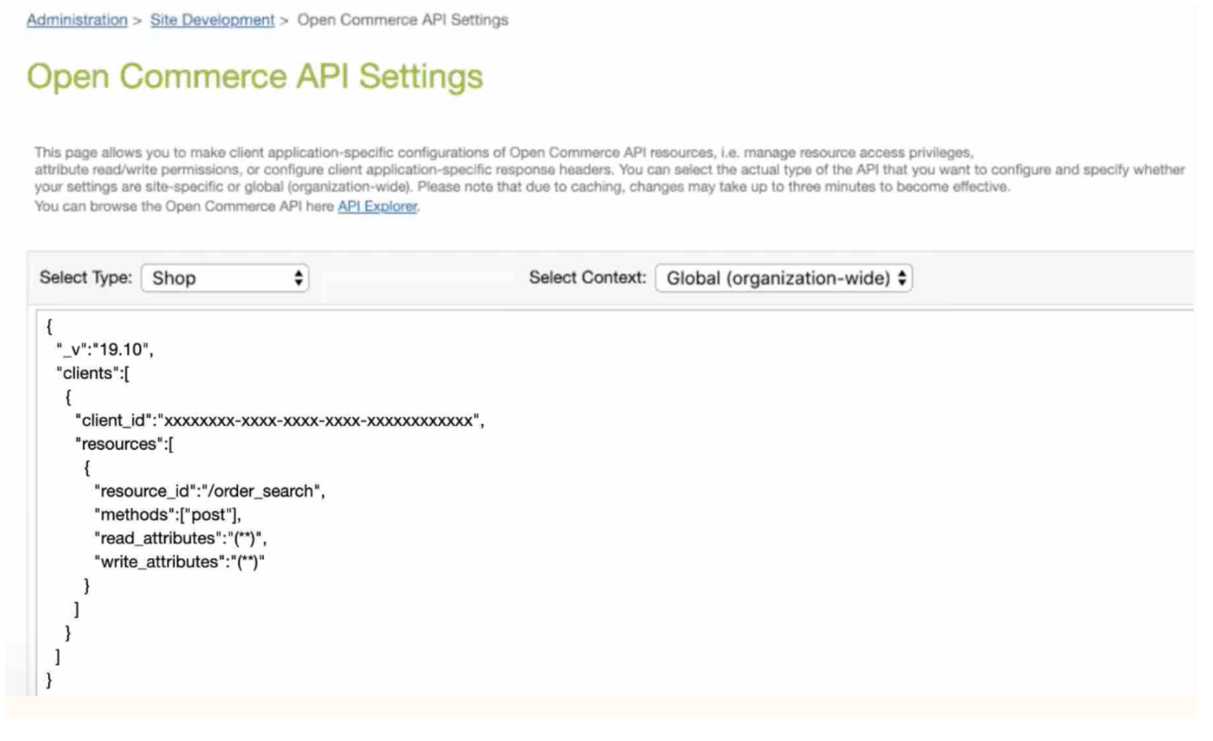 Une fois ajoutés, les paramètres devraient ressembler à ceci :{ " _v":"SHOP_API_VERSION", " clients":[ { " client_id":"CLIENT_ID", " ressources":[ { "resource_id":"/order_search", "methods":["post"], "read_attributes":"(**)", "write_attributes":"(**)" } ] } ] } - Ajoutez le JSON suivant sous le type Data et le contexte Global (organisation-wide), en remplaçant DATA_API_VERSION par la version de votre OCAPI Data API, puis cliquez sur Save.