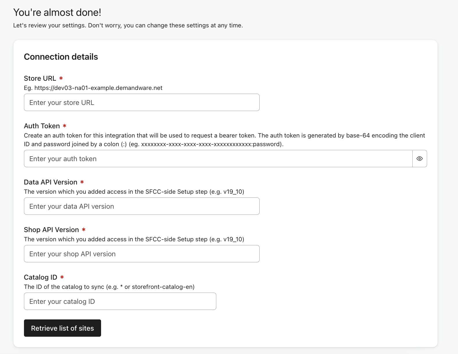 - Une fois que vous avez saisi ces informations d'identification, cliquez sur le lien Récupérer la liste des sites pour récupérer une liste des sites sur votre instance SFCC.