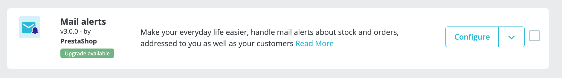 Ensuite, vous devrez bouton bascule sur un paramètre dans PrestaShop. Avant de procéder au réglage, assurez-vous que le module d'alertes de courrier est installé dans PrestaShop et que la disponibilité des produits est activée :
