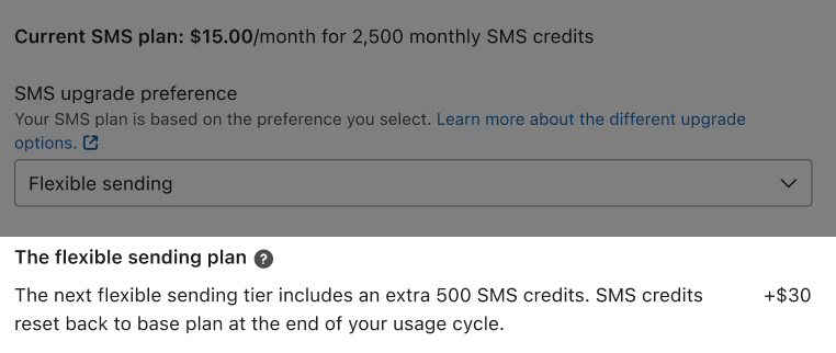 Découvrez comment changer de préférence de mise à niveau de la facturation pour les messages : mise à niveau automatique, utilisation de l’envoi flexible ou aucune préférence (pour une mise à niveau manuelle).