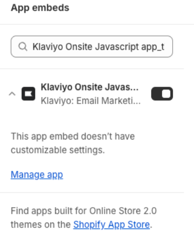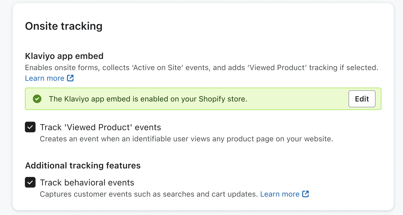 Vous pouvez souhaiter supprimer le suivi sur site pour des raisons de rapidité du site, bien que Klaviyo.js ait été récemment mis à jour pour minimiser son impact à cet égard. Notez que Klaviyo Shopify l'intégration de l'application de contourne le gestionnaire natif de du site web tag et peut entraîner un chargement plus rapide du KlaviyoJavaScript de . En outre, nous suivons certains événements par l'intermédiaire d'un pixel de serveur Shopify(collection consultée, recherche soumise et ajout au panier).