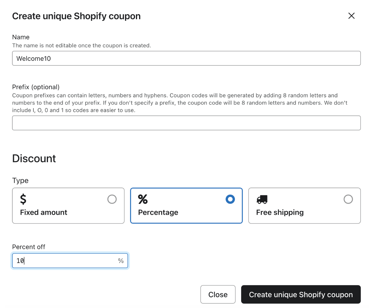 - Donnez un nom à votre code de réduction (par exemple 10OFF) et ajoutez un préfixe facultatif.