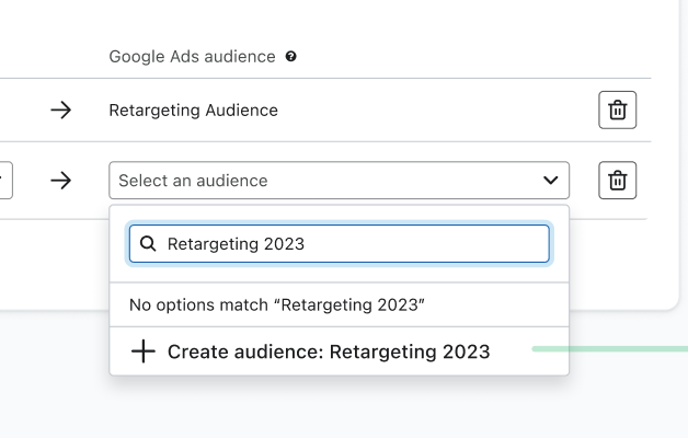 - Sélectionnez une audience Google à connecter à votre liste ou à votre segment. Si vous devez créer une nouvelle audience Google, saisissez le nouveau nom dans le champ de recherche et cliquez sur + Créer une audience : [Nom de l’audience].