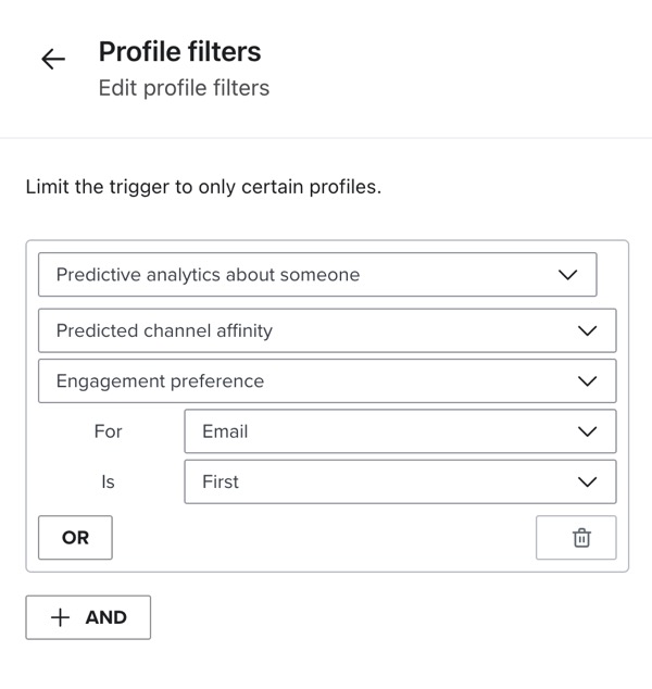- 트리거를 선택하고 오른쪽 사이드바의 프로필 필터 옵션 옆에 있는 추가 또는 수정 버튼을 클릭합니다.