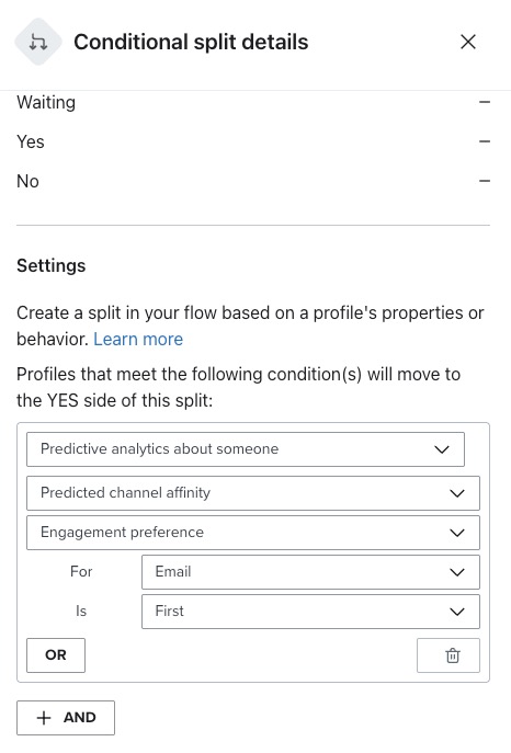 조건부 분할에서 채널 선호도 속성을 사용하여 채널 선호도에 따라 플로우에서 프로필을 다른 경로로 보낼 수도 있습니다.