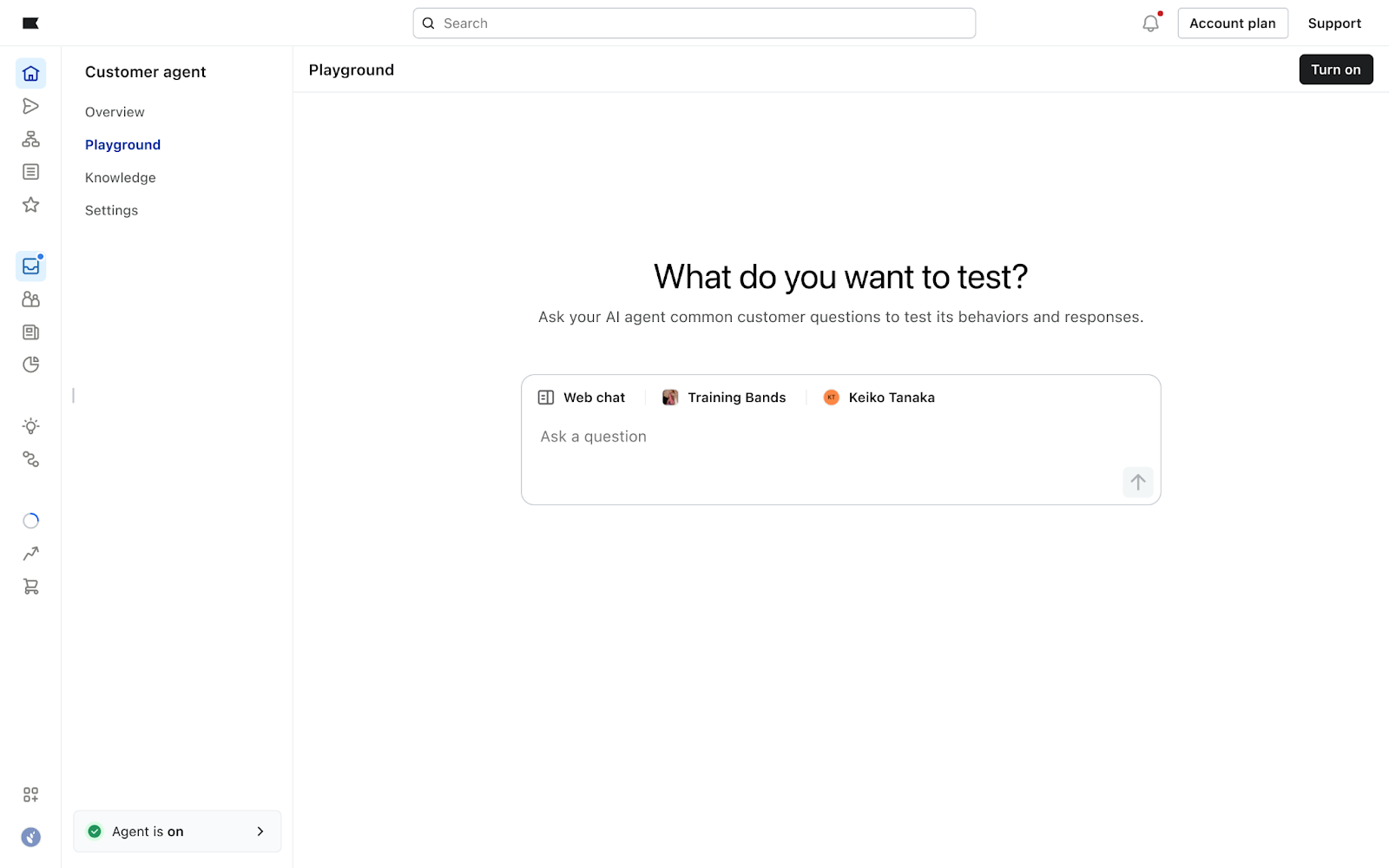 Se você estiver confiante com as respostas, ative pelo menos um canal no canto inferior esquerdo da tela para ativar o Customer Agent nesse canal específico. Se você quiser continuar testando ou melhorar o conhecimento do Customer Agent, continue no restante deste guia para obter dicas adicionais de treinamento e otimização.