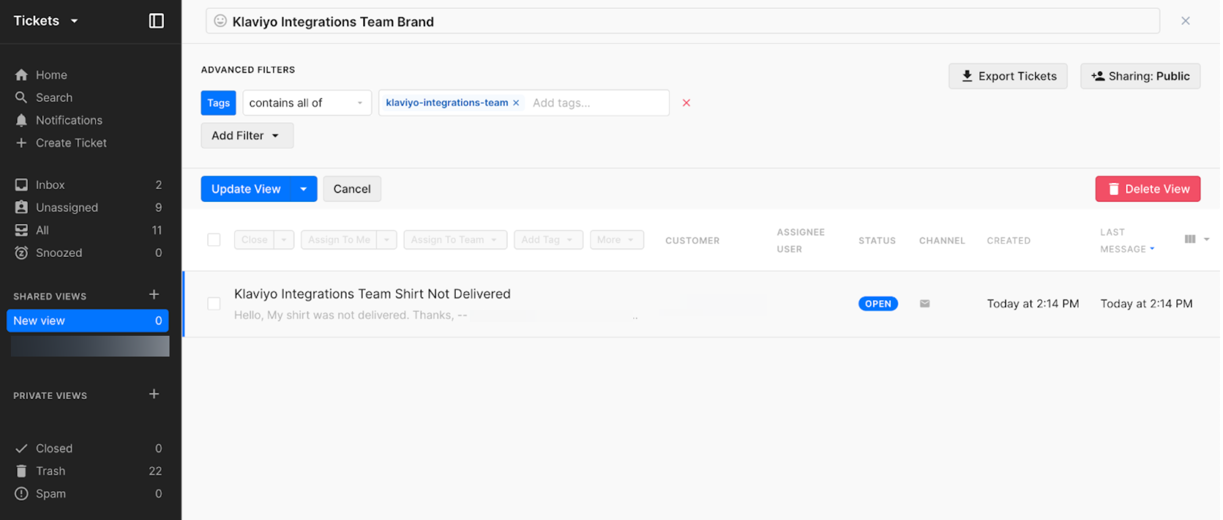 - Recomendamos conectar uma marca Gorgias por conta Klaviyo. Em Tickets, selecione a tag correspondente à marca Gorgias que o senhor deseja usar com essa conta da Klaviyo e sincronizar novos tickets com a Klaviyo.
