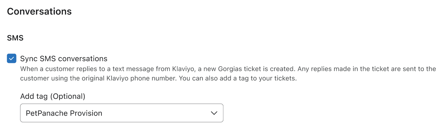 - Se o senhor estiver usando Conversas por SMS: Em Conversas, recomendamos adicionar um tag correspondente à marca Gorgias que o senhor deseja usar com essa conta Klaviyo.