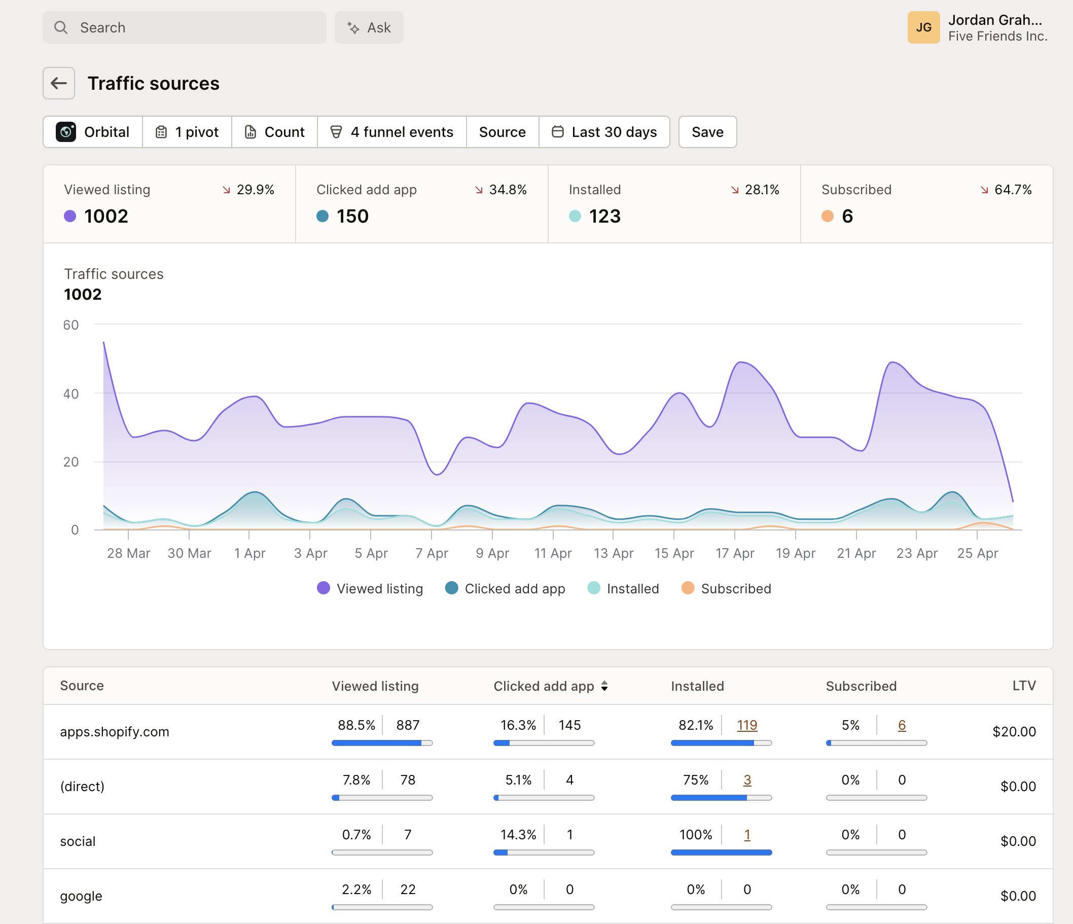The funnel events show a cohorted customer journey. For example, if the report shows 1,000 app listing views and 200 installs, this means that 20% of the merchants who viewed your listing continued on to install your app. This true conversion tracking helps you identify exactly where merchants drop off in your acquisition funnel and which traffic sources deliver the best conversion rates through each stage.