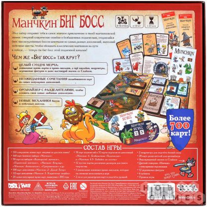 "Манчкин: Биг Босс" – это грандиозный набор, который отправит вас в самое масштабное приключение в вашей манчкиновской жизни. Он объединяет лучшие карты из самых популярных дополнений, создавая неожиданные и взрывные комбинации, которые вы ещё не испытывали. Теперь ваш путь к победе станет ещё более непредсказуемым!