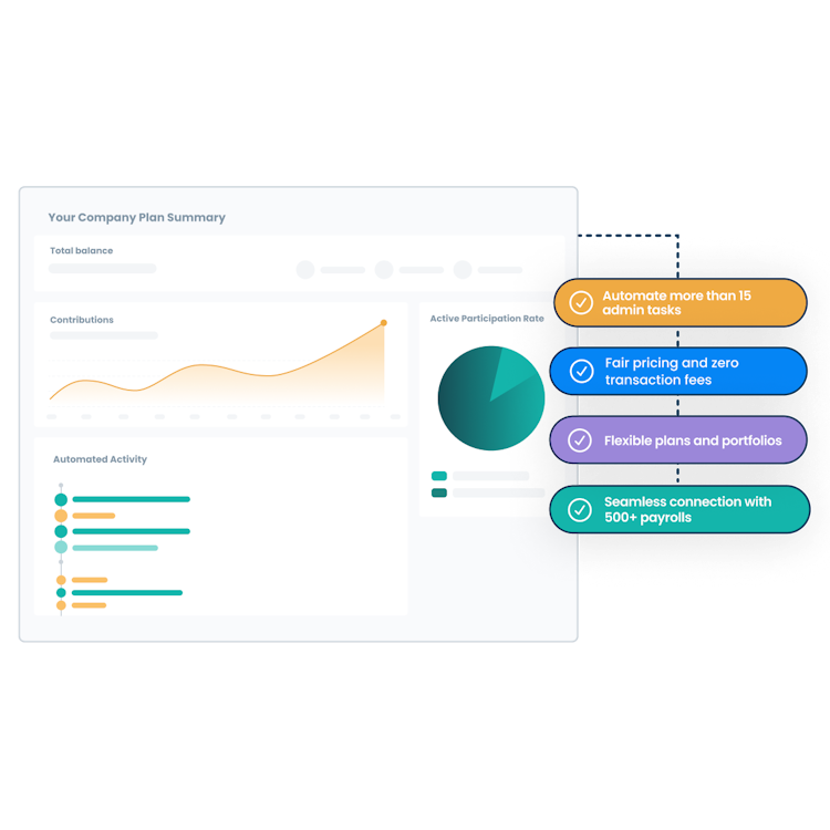 Your dashboard gives you a 360-degree view of your company plan, including employee participation and contribution reports. Employees can start saving in a few easy steps with our seamless onboarding and built-in investment education.
