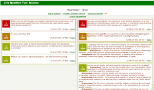 DPlay — “Democracy Playground.” “How do you liberate learning for self-reflection.” They created a platform for debating issues and reflecting on one’s own positions. Students fill out a little survey about the opposing positions, reflecting on why they react against it. These surveys are compiled over time. Is a student changing her vote often? Is she always voting with her friends?